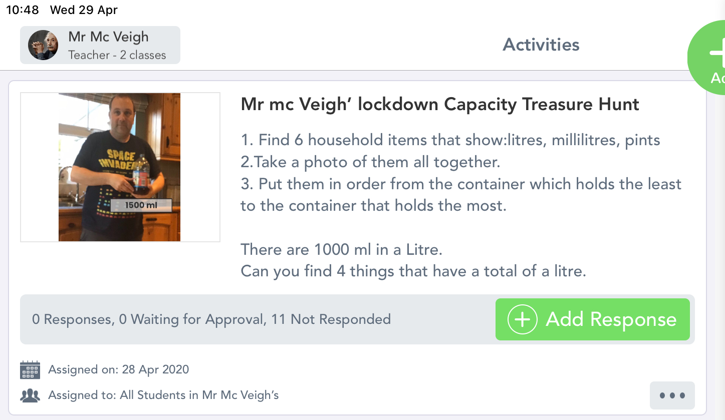Today I have set a capacity challenge on Seesaw. If you are not connected to Seesaw you can still complete the task and send a photo to my email. Remember I would love to see some of your photographs. Below in the attachment is the task. Good Luck.